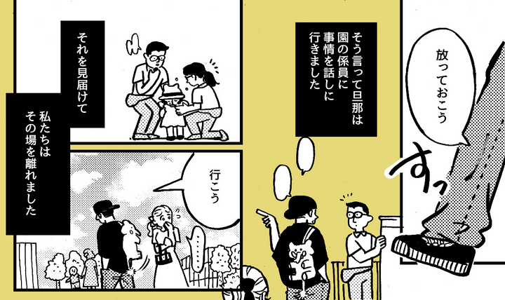 私(ヒトミ)は、旦那のシンジと4才の息子・ナオキとの3人家族。共働きで平日ゆっくりと一緒にいられない分、休みの日は家族でお出かけすることが多いです。今日も3人で動物園に。動物を見るだけではなく、大型の遊具で遊べたり、食事ができる場所があったりと、1日通して楽しめる場所です。ちょうどナオキと別行動のタイミングで、子どもの泣き声が聞こえました。どうやら小さな子がケガをしている様子。私が慌てて駆け寄ろうとすると、旦那は「行かない方がいい」と制止してきたのです。