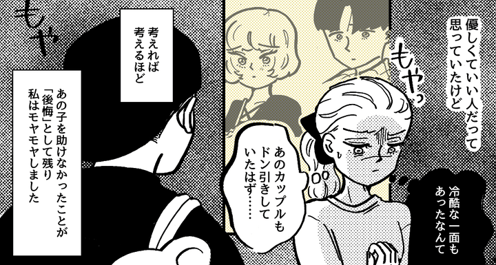 満面の笑みのナオキと会話しながらも、私はモヤモヤした気持ちが晴れません。考えれば考えるほど、あの子を助けなかったことが「後悔」として残り、私はモヤモヤしました。