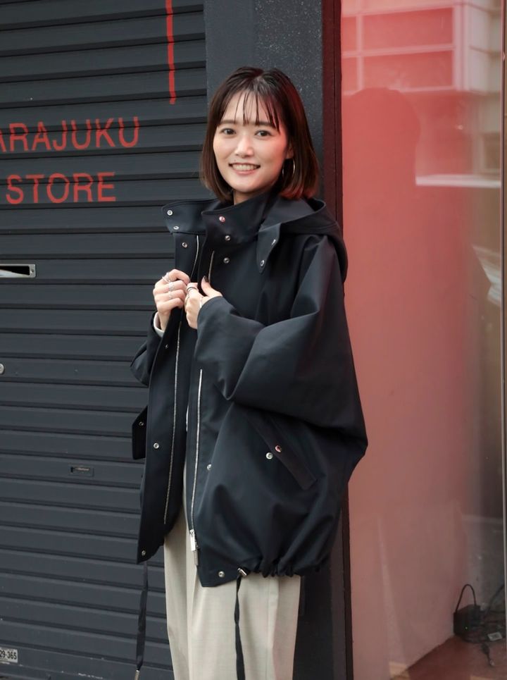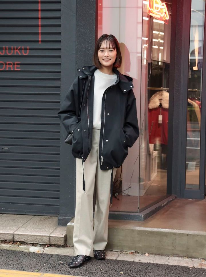 「このブルゾンはインナーダウン付きで、その日の気温に合わせて調整できるところが優秀な一枚。スタンドカラーで首を隠せるところが大人っぽくてお気に入りです。ブルゾンがカジュアルテイストなので、シックなカラーでまとめてキレイめな要素もプラスしています」