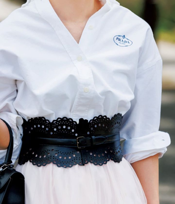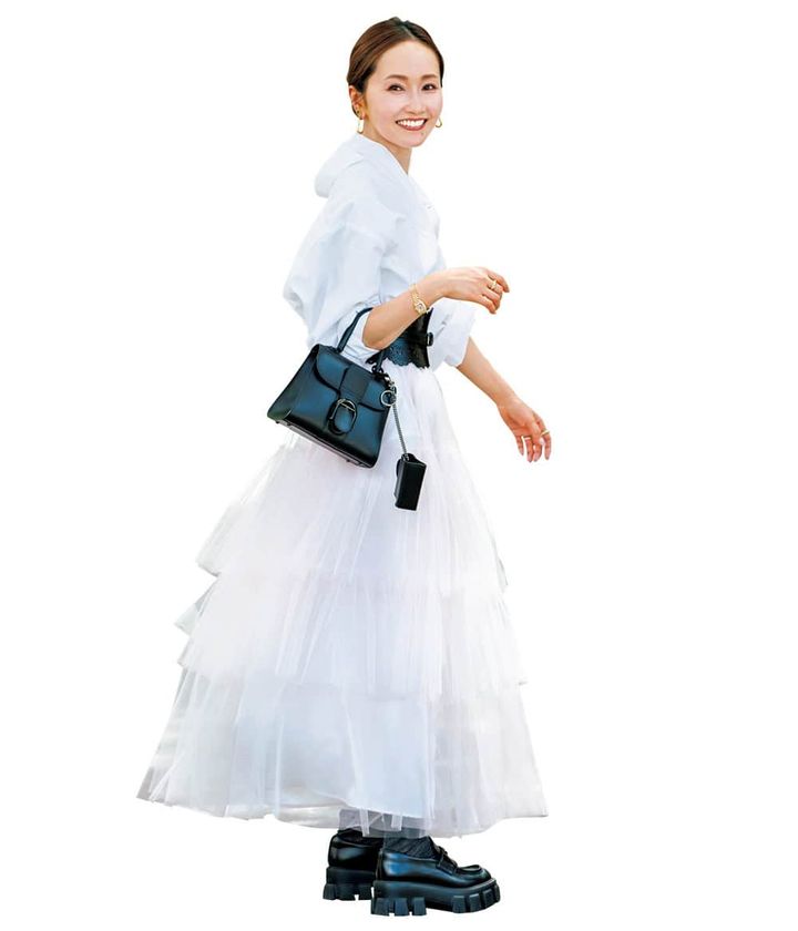 「友人とのランチ会は、淡ピンクのチュールスカートと合わせてドレスアップ。シャツの裾はINして太ベルトでウエストマークします。」
