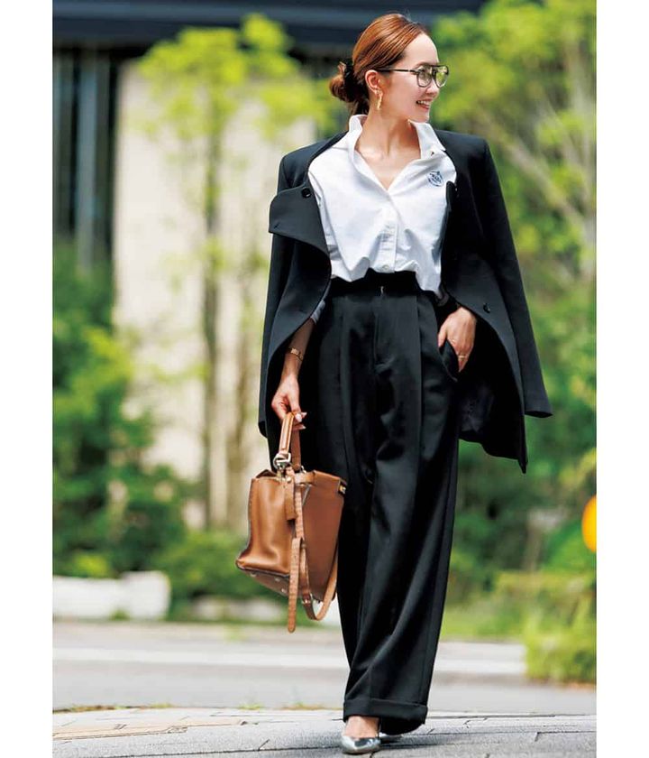 「打合わせにはジャケットとパンツでスーツっぽく。重く見えないよう胸元の開きを微調整。シルバーシューズでエッジをプラス。」