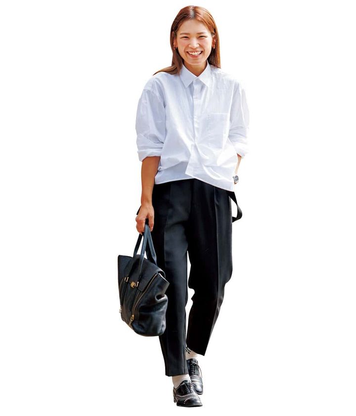 「シャツのボタンを掛け違いにして短か丈にアレンジ。ボタンも上までしっかり留めて、黒パンツを合わせれば格段ときちんと感UP。」
