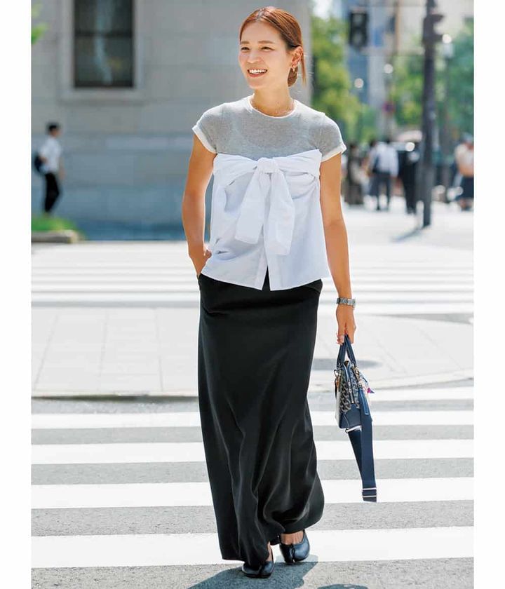 「Tシャツに白シャツをベアトップ風にレイヤードするだけでシャレ感アップ。ロングスカートを合わせて、ヘルシー感も忘れません。」
