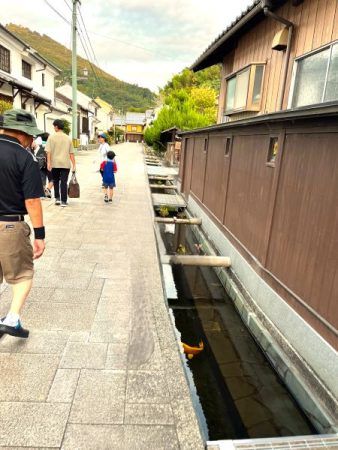 水郷大洲。水路には透明できれいな水が流れており、鯉も泳いでいました。この水がきれいだと川の水の状態も良いとのことで、当日の水は澄んでいていてとても綺麗だったので、わくわく♪