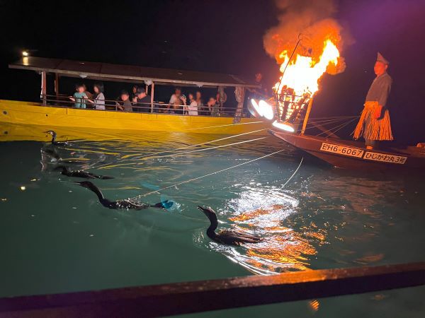 実際に間近で見ると想像していた以上に迫力がありました。船の先に篝火(かがり火)が焚かれ、その熱も伝わります。辺りが真っ暗の中に力強い炎の灯りがあり、伝統的な衣装に身を包んだ鵜匠さんが船に立っているその光景はとても幻想的に感じます。そして船と鵜を自在に操る技術もまた見事としか言いようがありません。