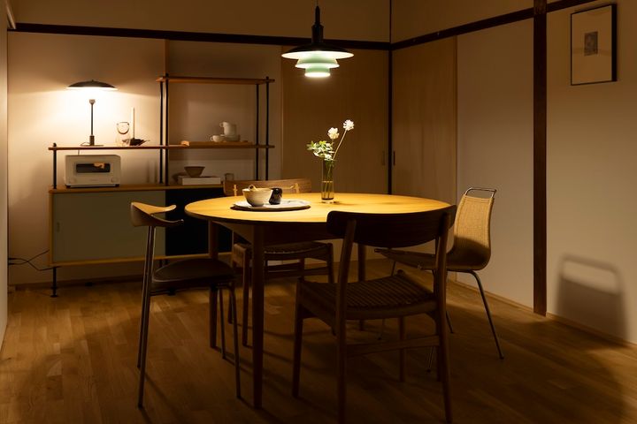 伝統的な日本家屋が蓄えてきた「経年の美しさ」が光る空間に、ハンス J. ウェグナーの「CH23」や「CH88P」、ボーエ・モーエンセンの「BM0121 ダイニングテーブル」などの名作家具が自然に溶け込んでいる。