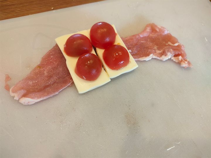 2.ミニトマトはヘタを取り半分に切ったら、広げた豚バラ肉の上にチーズと一緒にのせて巻く。