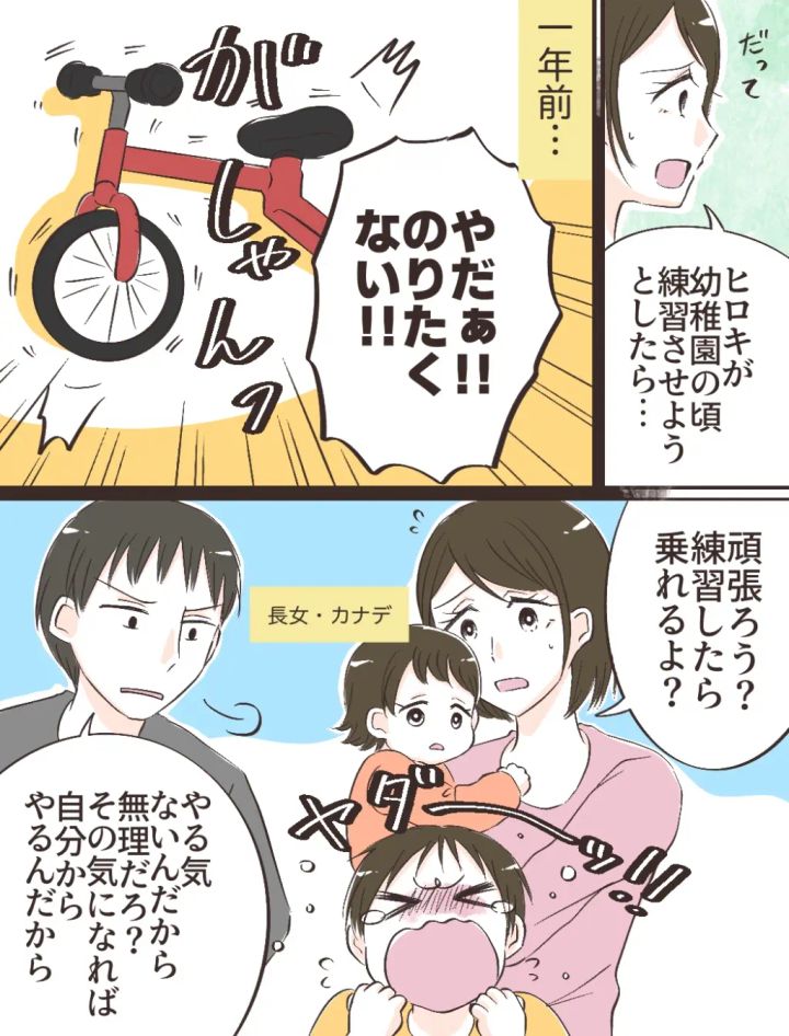 ヒロキが幼稚園の頃、私はヒロキが自転車に乗れるように、トレーニングバイクで練習をさせていました。「いやだぁ!乗りたくない!」と泣き叫ぶヒロキに「頑張ろう?練習したら乗れるよ?」と励ます私でしたが、ショウヘイは「やる気ないんだから無理だろ?」とため息。「その気になれば自分からやるんだから」と言い切りました。