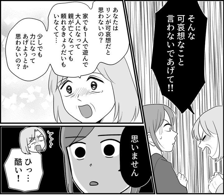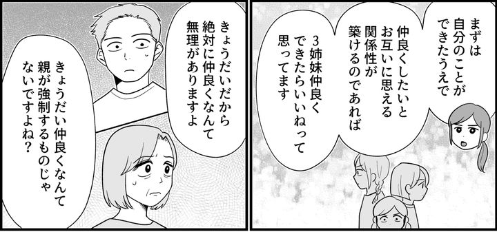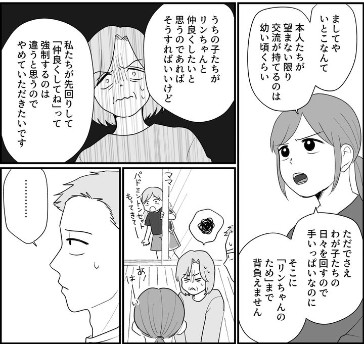 「この世でたった4人のいとこなんだから……」となぜかウチの3姉妹とリンちゃんをひとくくりにしたがる義母。私は「違います。3姉妹+いとこ1人です」と丁寧に修正します。そもそもなぜ、義母はそこまでして、ウチの3姉妹の中にリンちゃんを入れたがるのでしょうか? あくまで「いとこ」であるだけなのに。