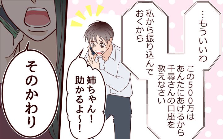 しばらくして、義姉がこれまで冷たくしてきたことを千尋に謝罪。義母は昔から将太だけに甘く、義姉はそんな母弟が大嫌いなのだという。その後、千尋は将太に裏切りの証拠を突きつけ、会社にバラされたくなければ「慰謝料一括500万を払ってすぐに離婚して」と告げて…。