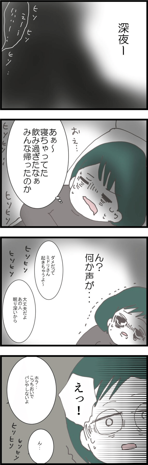 その日の深夜、寝落ちしてしまった妻が目を覚ますと、何やら怪しげな会話が聞こえてきたのです…!