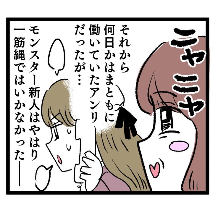 OLルナは女の武器を最大限に使い、職場でも何不自由なく過ごしていた。だが、同部署に新入社員のぶりっこアンリがやってきたことで状況は一変。あっさりと男性陣の人気を獲得するアンリに、ルナは闘志を燃やしていく。アンリはまるで仕事に集中しておらず、就業中にペン習字をやる始末。それを係長に報告すると、アンリは泣きながらトイレへ逃げてしまう。係長から悪者扱いされたルナが仕方なく様子を見に行くと、個室からくしゃみの後に「ちくしょうめ」という声が聞こえ、ふだんは“ぶりっこ”を演じていることが確定。さらにはスマホゲームまでしていることに気づいたルナは「期待の新人さん、なかなか戻ってこないなー!」と大声でアピール。するとアンリは、慌てて席に戻って…。