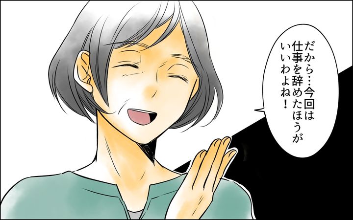 ぬか喜びさせないように、今度は義母への報告を待ってもらったつもりだったのに…。さっそくお祝いにやって来た義母から、今度は仕事を辞めるように迫られたのです。