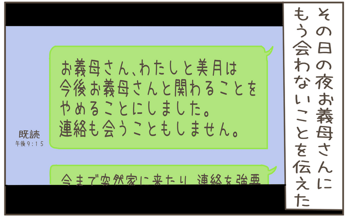 決意を決めたトモ香は以後、義母との連絡を断ち、すべての対応を夫に任せることに。