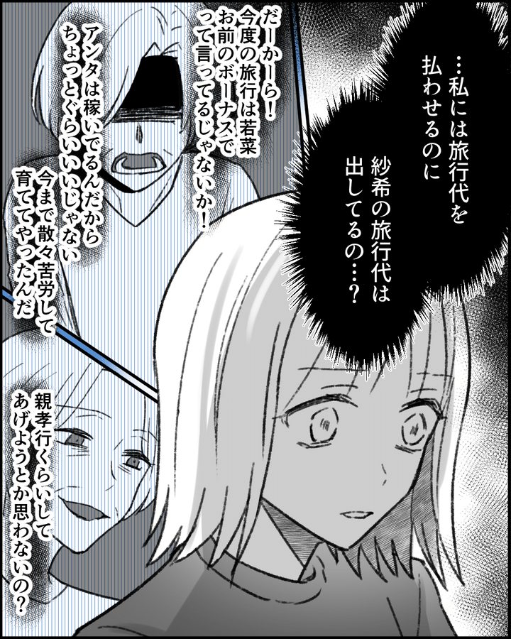 女手ひとつで育ててくれた母親に親孝行したい気持ちはあるものの、義妹にまでタカられ続け、妻は負担を感じていた。さらに義祖母の旅行代を支払ってもらっていないにもかかわらず、また義母から旅行をタカられていたのだ。さすがに負担が大きいため反論すると「親孝行しろ」と言われてしまい…。