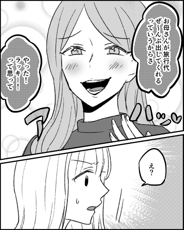 そんなある日、妹から旅行のお土産をもらったので嫌な予感がしたのです。さりげなく「どこに行ったのか」聞くと、母がすべての費用を負担してくれたから2人で温泉旅行に行ったと…。