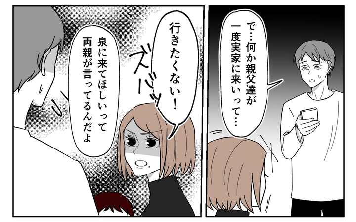 元旦に義実家を訪れるとふたり目は男の子がほしいと言われるが、泉は1人で家事をしていること、そして生活に余裕がないことからふたり目の予定はないと発言、義実家と夫が作り上げた援助を惜しまない義実家像やイクメン夫像を打ち砕く。
