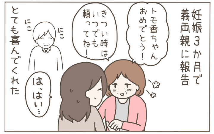 結婚後すぐに妊娠がわかり、妊娠3か月で義両親に報告。「きつい時はいつでも頼ってね」と義母は温かい言葉をかけてくれるのでした。