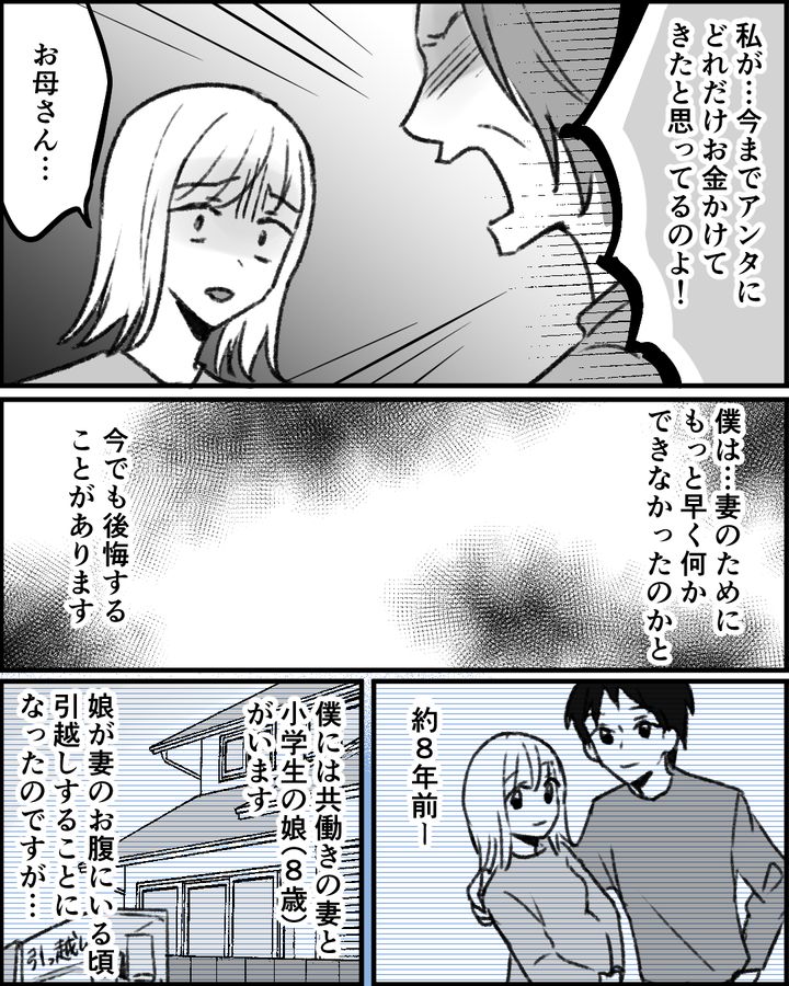 義母に女手ひとつで育てられた妻は、事あるごとに「母親に恩返しをしたい」と言っていた。妻の実家の近くに住んだのも、義母への親孝行のひとつ。旅行や食事の費用も「母親のため…」と、お金を出していた妻だったが、義母だけでなく義妹まで妻にタカりはじめ、次第に妻の負担が増していく。