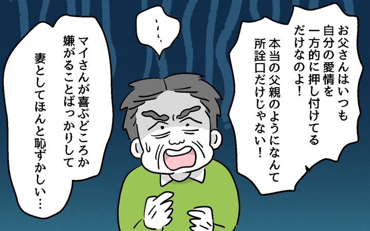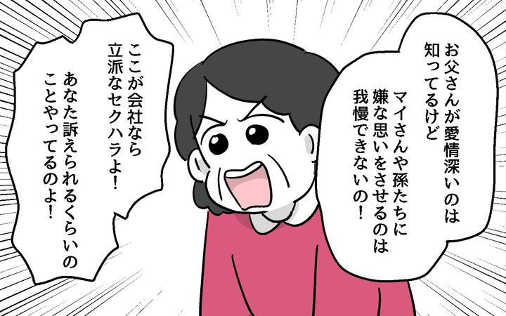 我慢の限界に達したマイは義父に「気持ち悪い。我慢できない」と言ってしまうが、義母はマイの気持ちを理解してくれていた。しかし義父は家族だから、愛情があるから、と改めない。しかも夫も妻のマイではなく、義父をかばう発言をしてきて…。