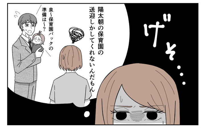 最初は育休をとり妻を支えると言っていた陽太だったが、娘が産まれても飲み会で遅く帰る日々が続き、家事育児もできなかった。義母も手伝いに来てくれたが、泉を寝かせてはくれず、寝不足に悩まされる。結婚記念日にもスイーツを買ってくると言っていた陽太は約束を忘れていた。翌朝仲直りしたがモヤモヤした気持ちが残るのだった。