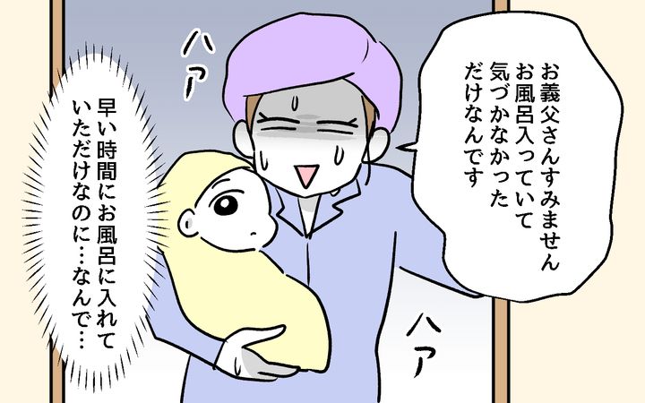 産後、夫がはじめての出張で、私ひとりで娘をお風呂に入れていたときのこと。またアポなしで義父がやってきました。
