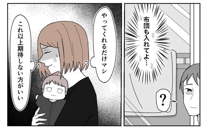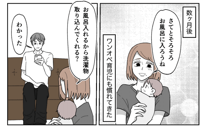 出産後、妻を労わると宣言していた夫の陽太は育休を取らず、出産祝いの飲み会に続けて参加した。早く帰るようになっても家事能力も低く戦力外。寝不足に悩んだ泉は義母に手伝ってもらうことにするが、義母も寝かせてはくれず、2人目を急かし、かえって気を使うはめに。