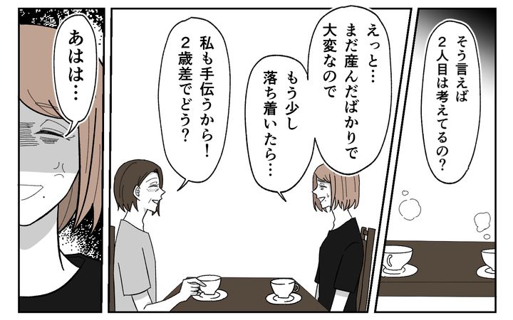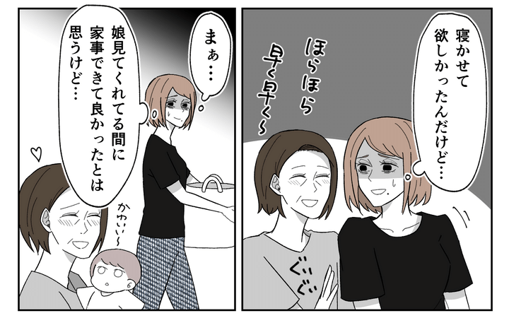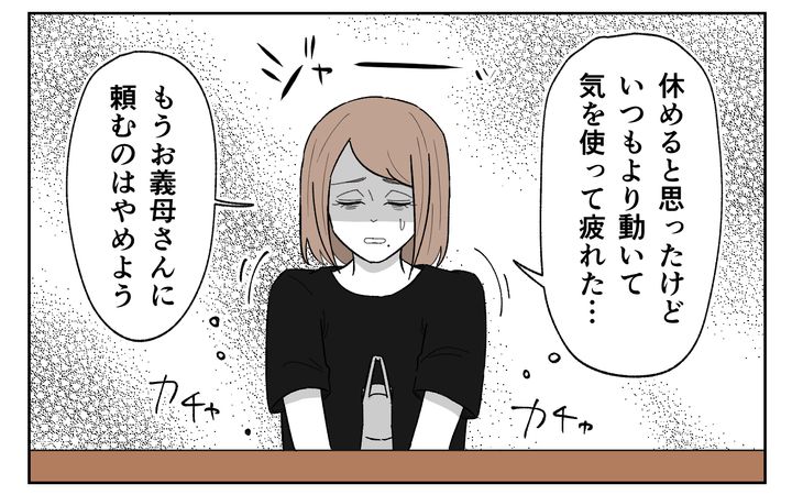 娘が寝ていた時間は、義母のおしゃべりに付き合い…。2人目の催促をして気分よく帰っていった義母。いつもより動いて気を使って疲れきった私。義母が使ったカップを洗いながら、お手伝いを頼むのはやめようと心に決めた瞬間でした。