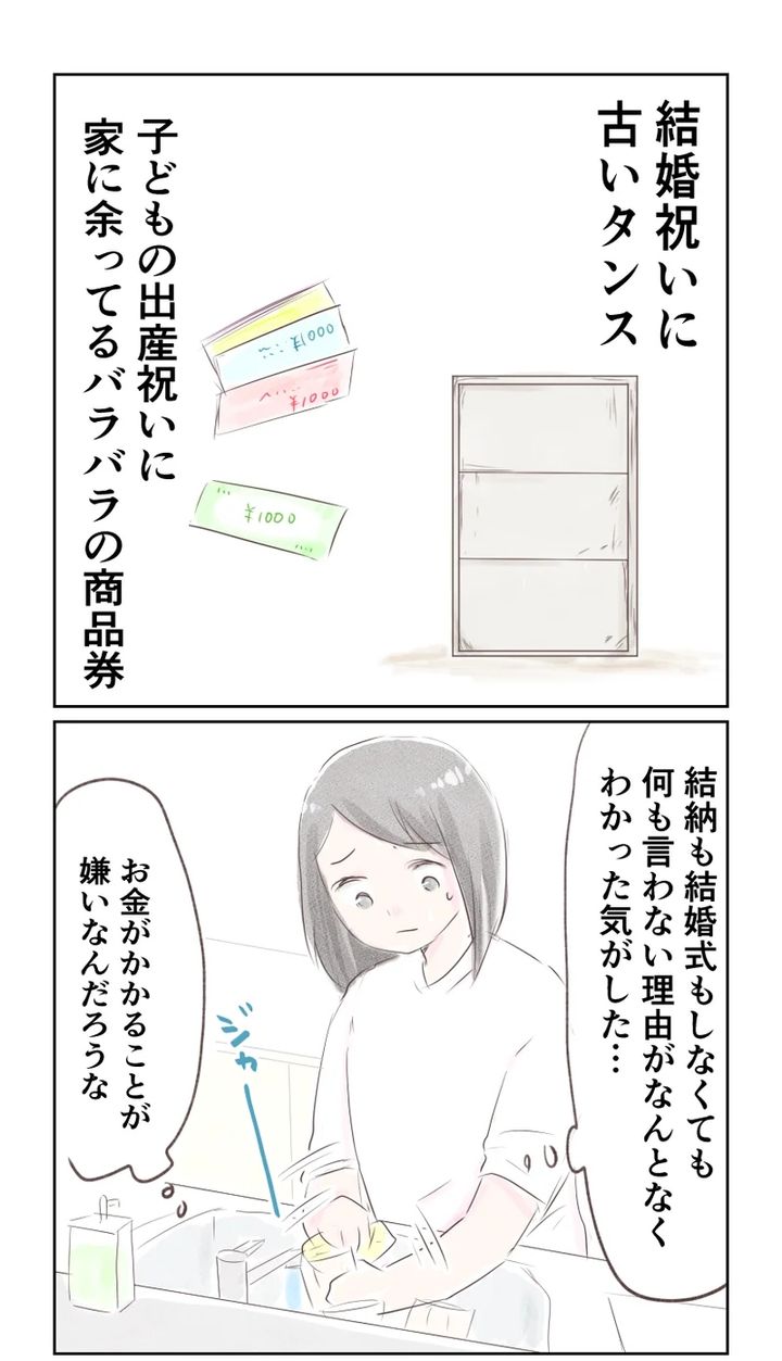 義両親は息子夫婦の節目を祝う気持ちよりも、「お金を使いたくない」という気持ちが強いらしいことに気付いた美穂さん。ユウタさんは気づいているのかいないのかきまぐれなお祝いも喜んでいたそうです。