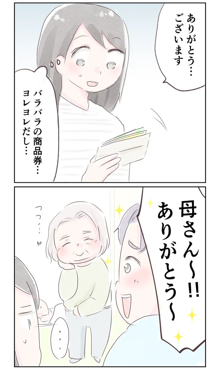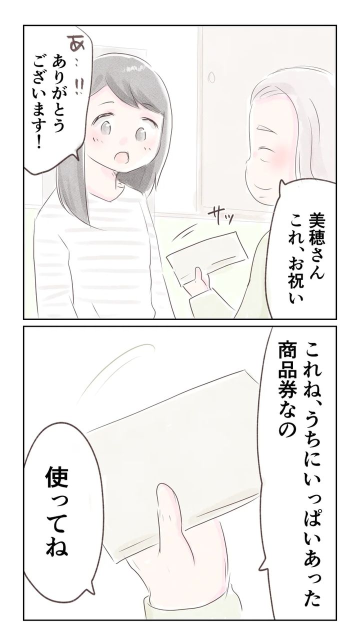 気持ちだと思って素直に受け取った美穂さん。でも、前のタンスの件もあるし、バラバラの商品券なんて、使い切れなかったものを渡してきただけなのではないかと疑ってしまいますよね。