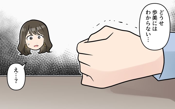 残業だと言っていた夫のあとをつけると、会社の同僚らしき女性とカフェに入って行くのが見えた。カフェで2人は仲良さげに談笑している。それをみて「もしかして浮気?私の愚痴をその女性に言ってるわけ?」と怒り心頭な歩美。夫がその女性と別れたタイミングで声をかける。