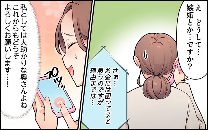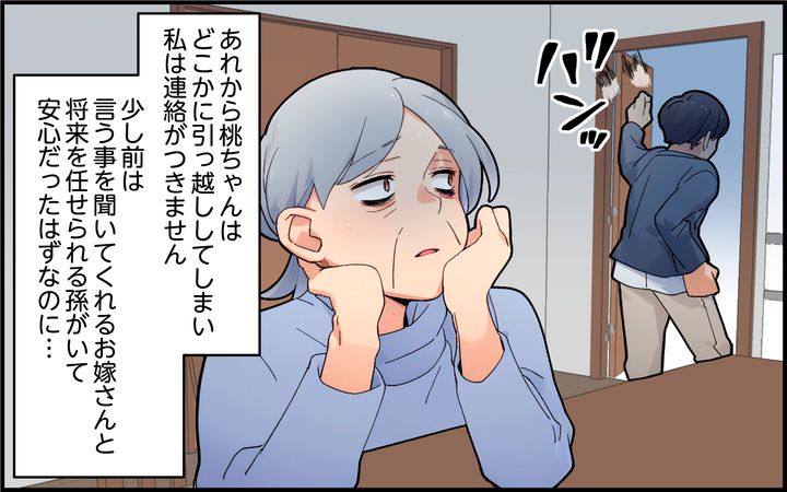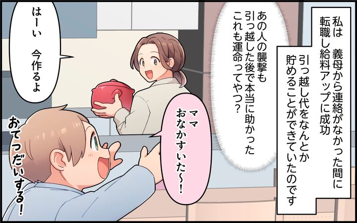 モラハラ夫と離婚後も義母から執着されていた桃。義母から元夫の再婚を知らされたので、養育費の支払いを念押ししたところ、義母から「いやしい」と罵詈雑言が返ってきた。そして1年後…。新しい嫁が浪費家だったので息子と復縁してと泣いてすがってくる義母に、桃は養育費が未払いになっていることを告げる。そして、逆ギレする義母を振り切り、そのまま姿をくらますのだった。