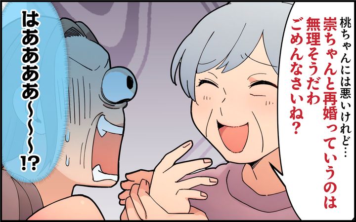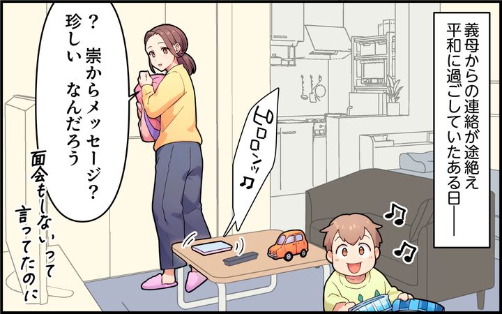 モラハラ夫と離婚後、義母から今後も孫に会わせてほしいと泣きつかれてしまった桃。次第に失礼且つ厚かましくなる義母から距離を置こうとすると、「恩知らず」と責められてしまう。孫よりも自分の幸せを優先する義母の本心を知った桃は連絡先をブロックするが、ある日、勝手に保育園まで息子のお迎えに現れる。不安と恐怖で限界を感じる桃だったが、その後、義母からの連絡がパタリとなくなり…?