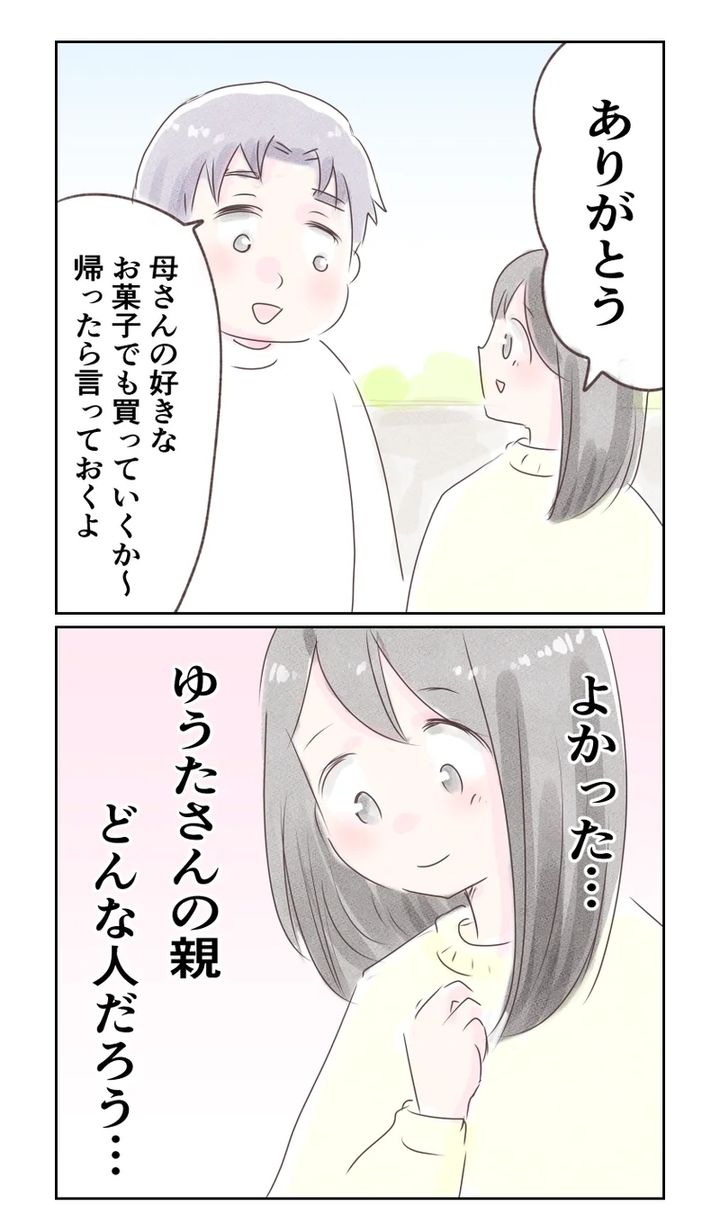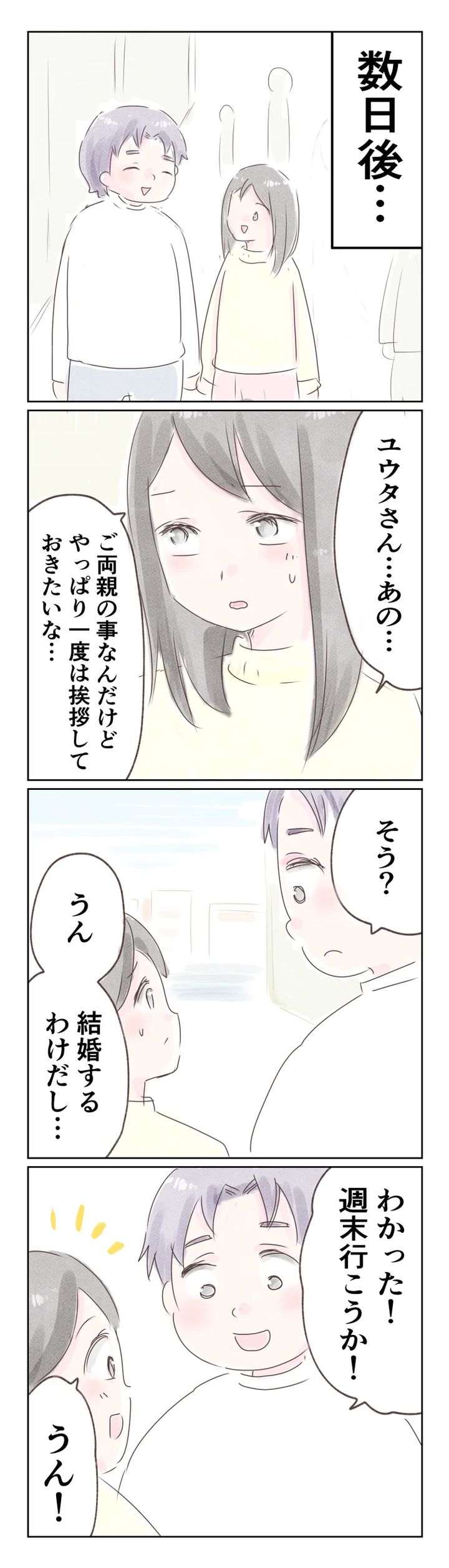過去の恋愛で傷つき、臆病になっていた美穂。しかし、ユウタは彼女の過去を知っても変わらず、1年後にプロポーズ。戸惑いながらも美穂は結婚を決意します。美穂は父と不仲だったため母だけに挨拶することに。一方、ユウタは自分の親に挨拶は不要だと言います。なんとなくモヤモヤする美穂。友人たちから同居している親に会わせないのは「変わってる」と指摘され、不安になり再びユウタに挨拶について相談することに。