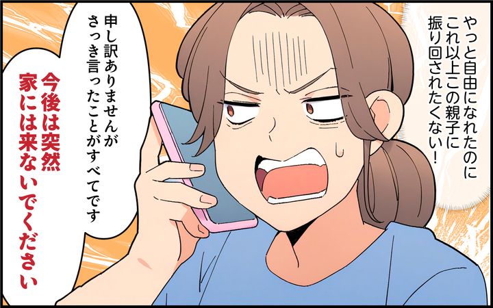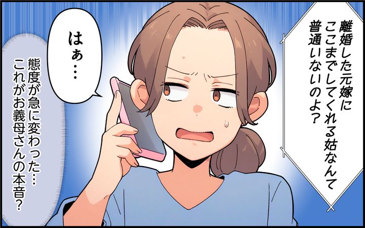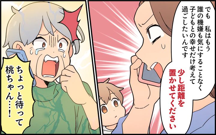 モラハラ夫と離婚後、義母から今後も孫に会わせてほしいと泣きつかれた桃。やむなく連絡先を交換したところ、頻繁に電話がかかってくるようになってしまった。困り果てた桃が距離を置くと、いきなり家のそばに現れ、その後は家にまでやって来るようになる。困ると伝えても泣き落としで桃親子に干渉してくる義母に桃がはっきりと断りの言葉を伝えると、態度が一変。義母が「恩知らず」と失礼なことを言い出した!