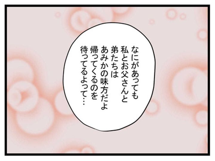 「なにがあっても、私とお父さんと弟たちはあみかの味方だよ」。誰にも助けてもらえないと思っていたあみかは、この言葉にどれほど救われたことでしょう。