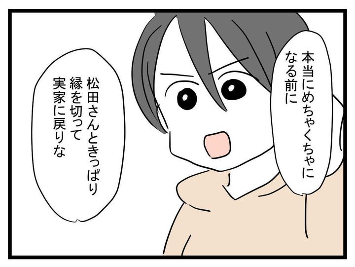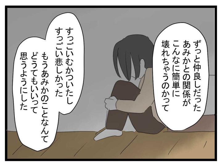 親友にブロックされてむかついた、悲しかったと、これまでの出来事を回顧。それでもあみかが心配だったといい、「彼氏と縁を切って実家に戻りな」とアドバイスします。