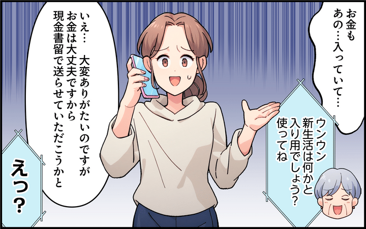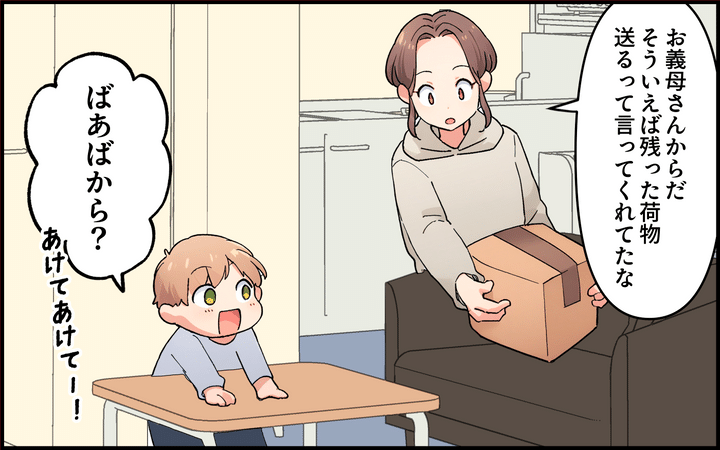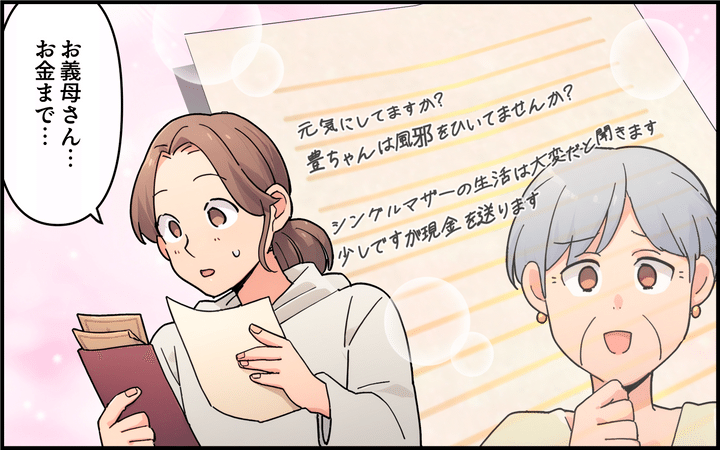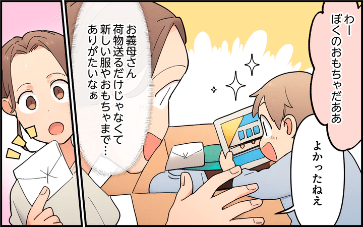 そんなある日、お義母さんから荷物が。中には私への丁寧なお手紙と息子へのおもちゃ、そして、現金が同封されていて…。
