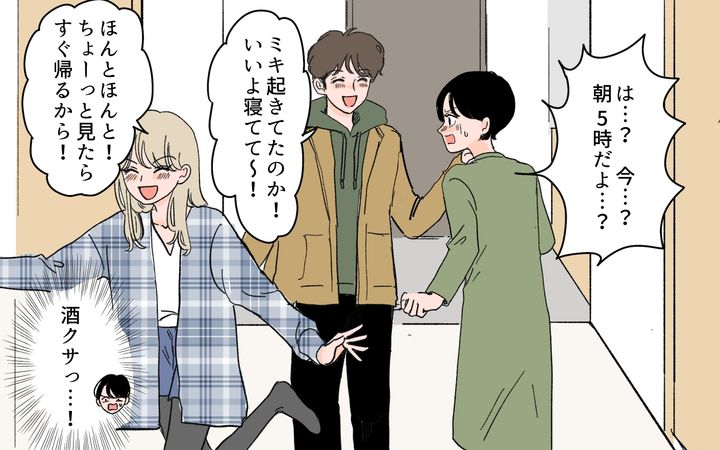 朝5時に酔っ払って女友だちを連れてくる夫…非常識な行動に妻の怒りが爆発!<男女の友情は成立する? 6話>【夫婦の危機 まんが】