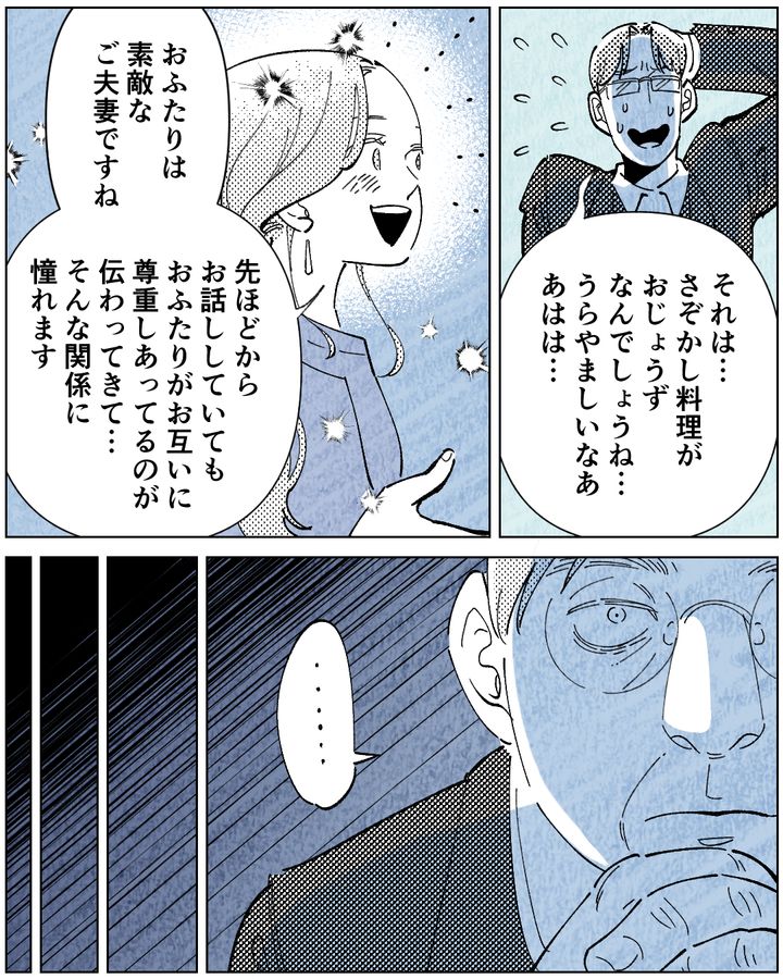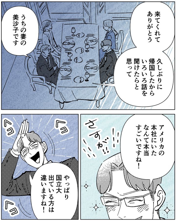 海外から戻ってきたという、新しい上司との会食に誘われた私。夫は学歴でおだててごまをすります。