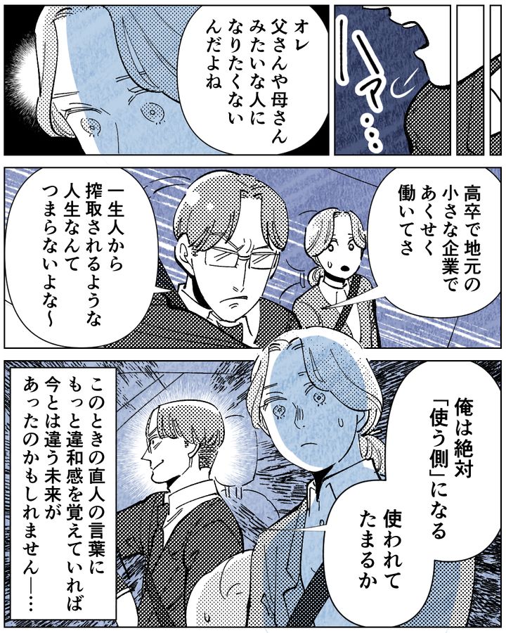 家族3人揃って職業体験テーマパークに出かけた週末。たまに息子と遊びに出かけたかと思いきや、息子にも学歴マウントを押しつけようとする夫。息子はただ楽しく遊びたいだけなのに…。慌てて夫を止めると、自分の行動を謝罪すらせずに、周囲の目を気にして1人どこかへ行ってしまう。息子の気持ちを考えない夫から、妻の心はどんどん離れていくが…。