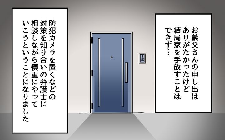 お義父さんは「すぐに引っ越すように」「お金なら援助する」と言ってくれましたが…。お隣さん以外は理想どおりのマイホームを手放すことはできず、弁護士さんに相談して防犯カメラなどを設置して対策を取ることになりました。