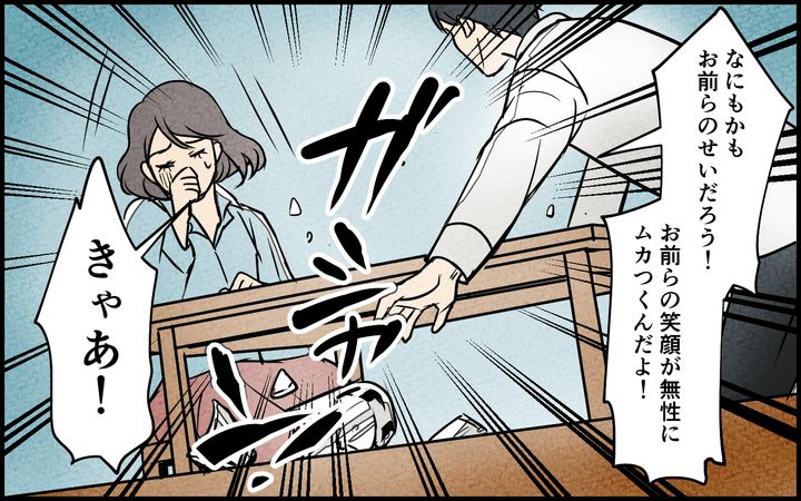 慎一郎は職場で叱られることが多く、ストレスを溜めていた。妻子が楽しそうにしているとイラつき、当たり散らすようになり…。