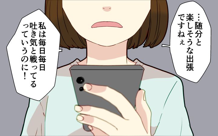 【相手とのやりとりを見る 1】女とのやりとりを見ると…浮かれた夫と女の写真が!(分岐Bルート)【つわりなめんなよ 1話】まんが