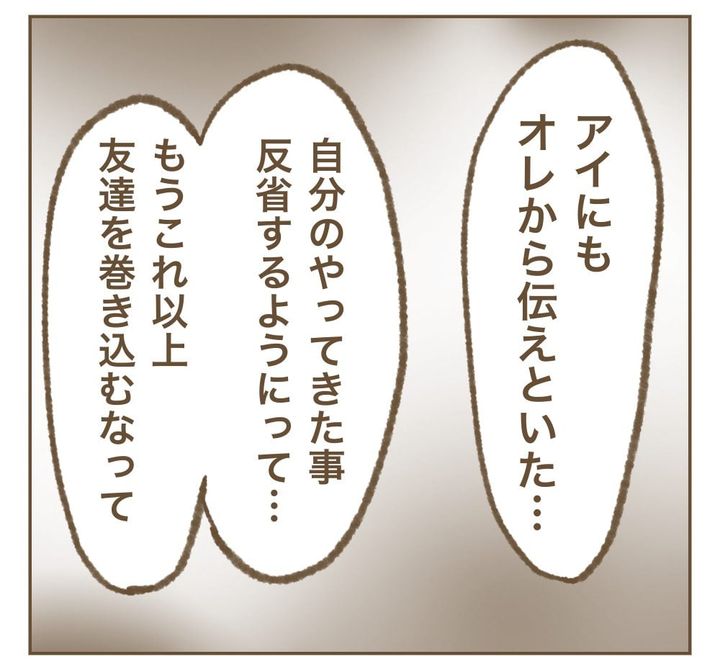 ねぼすけはつわりで苦しむママ友のアイちゃんのために上の子を預かっていました。しかし度重なるアイちゃんの非常識なふるまいに疑問を抱き、謎のサプリメントを売りつけようとされたことで距離を置くようになります。その後、アイちゃんは別のママ友に子どもを預けるようになりますが、そのことが夫・ダイくんの知るところになり、問い詰められます。アイちゃんは「映え続ける生活」を維持するためにお金が必要で、友人たちに協力してもらっていたと言います。