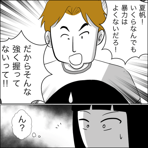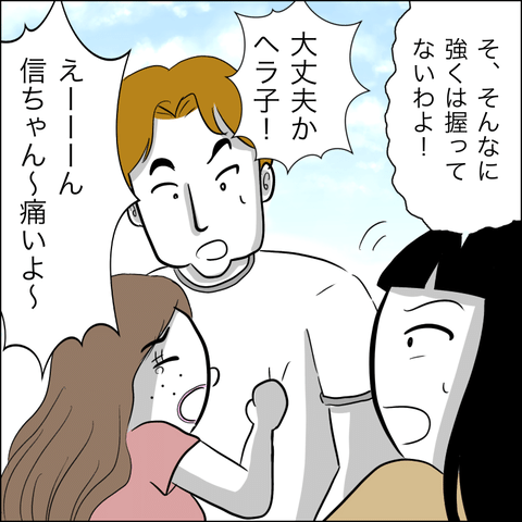 そんなに強く握っていないのに、「痛い!」と泣き出すヘラ子を見て信二もすっかりヘラ子の味方になってしまい、なぜか夏帆だけが責められる状況に…。