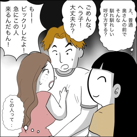 突然の妻の登場に一瞬たじろぐ疑惑の女性・ヘラ子。すぐに信二のもとに駆け寄りずいぶんと親し気な様子です。