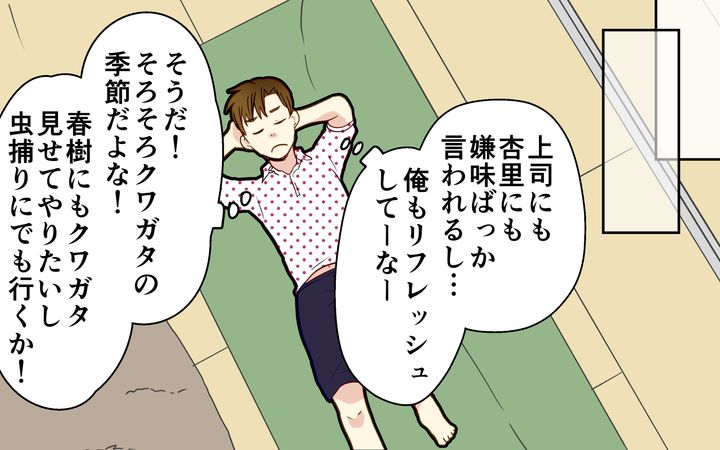そこで思い出したのがクワガタ! 俺は小さい頃からクワガタを捕るのが大好きで…。拓真にも虫捕りの面白さを教えてあげたいし、早速買い物の帰りに行ってみようと思いついたのだ。しかし、杏里から返ってきた言葉は…