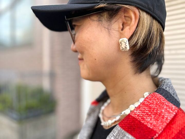 アディダスのキャップに、手描きっぽいユーモラスなグラフィックが踊るピアス。「ピアスは、今日、仕事のパートナーからお誕生日プレゼントとしていただいたんです」。手持ちのネックレスとも好相性。「50代もますますおしゃれしたいです」。