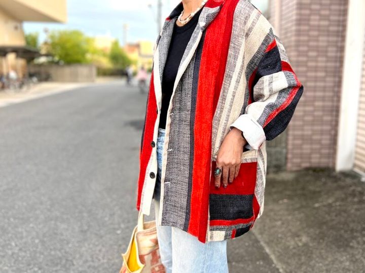 自身が手がける「Laugh(ラフ)」のアウター。ざっくりした素材感と、赤のマルチストライプがお気に入り。「赤に抵抗がある方もいらっしゃると思いますが、古着デニムやレースのスカートを合わせると、大人でも着こなしやすいスタイルに仕上がりますよ」。